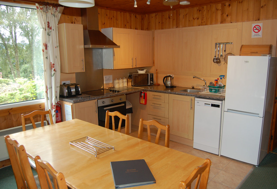 This spacious cabin comfortably sleeps 8 people with two double bedrooms, two twin bedrooms and two shower rooms. There is also a fully equipped modern kitchen and dining area with open views to the south including the hills beyond Loch Tay. The living room boasts bright natural sunlight and four comfy sofas – there’s also a flat screen TV and DVD player too (we can lend you DVDs, books and board games). You can also look forward to your very own outside seating area complete with brick BBQ. The EPC rating for this lodge is band E.